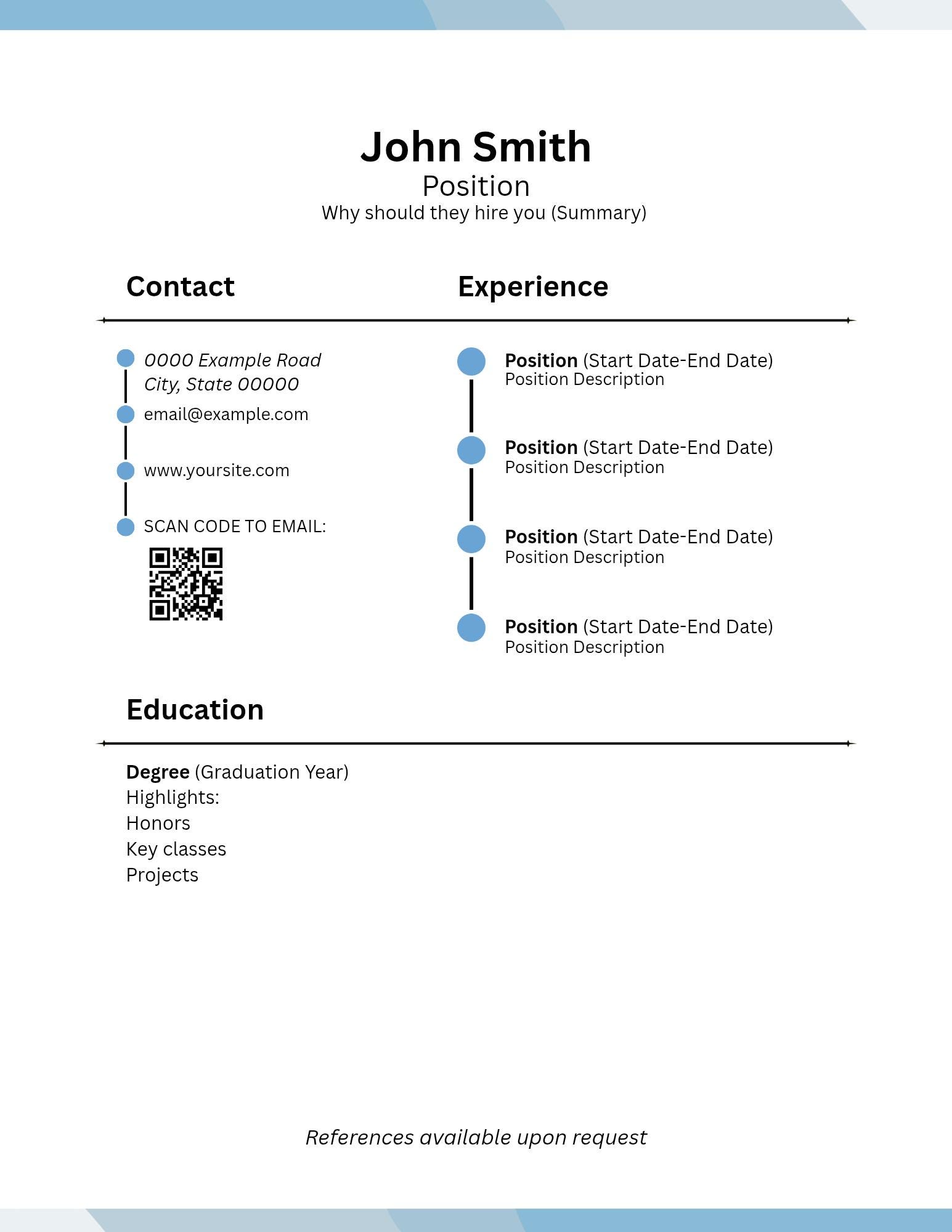 Resume Canva Template with contact information, education, and experience sections. Geometric minimalist template with blue accents.