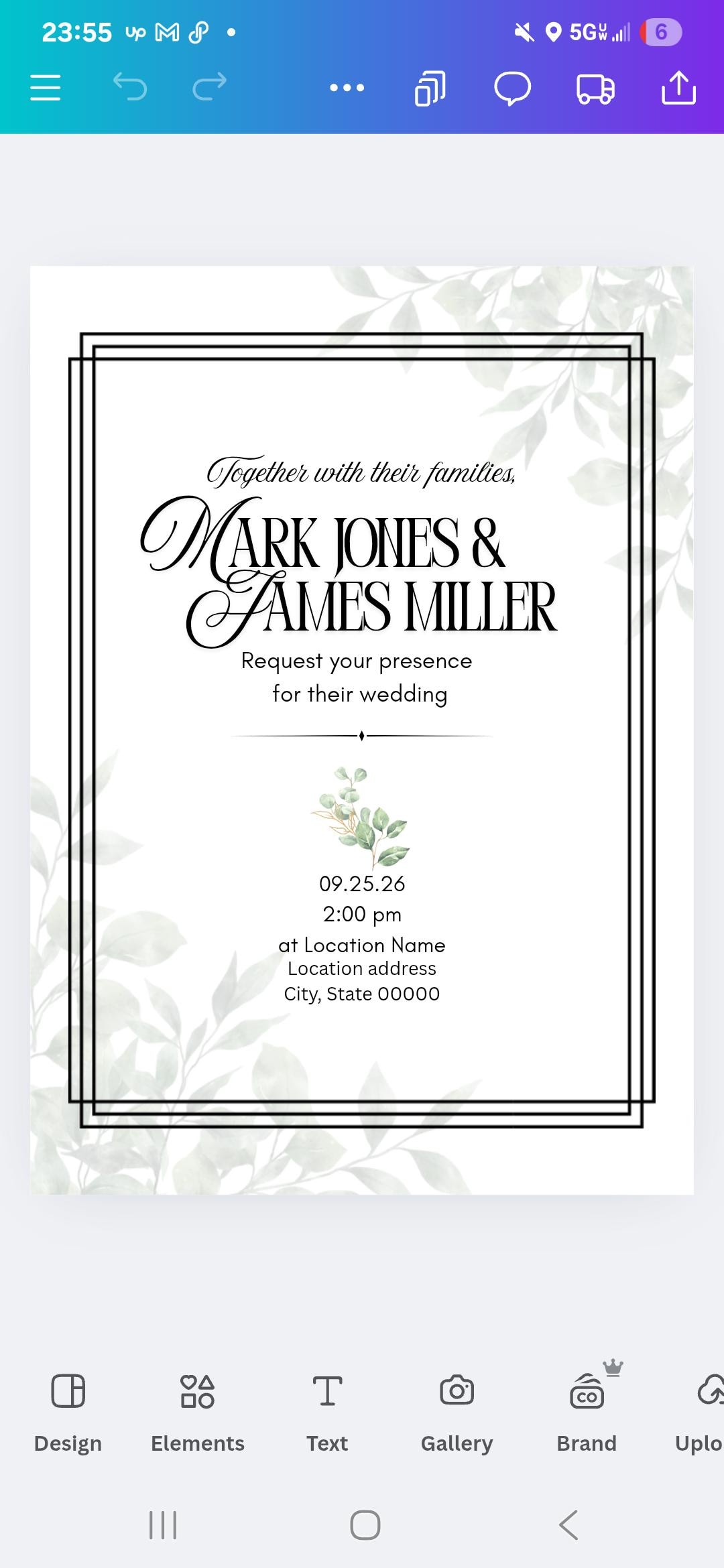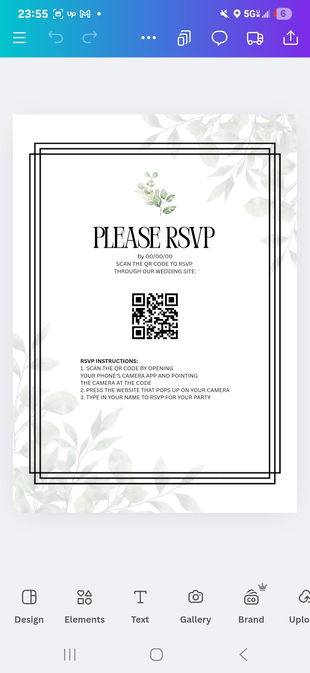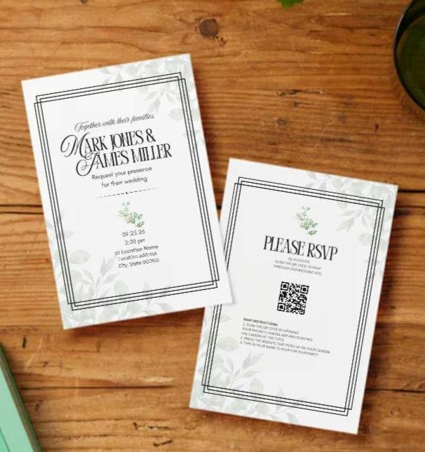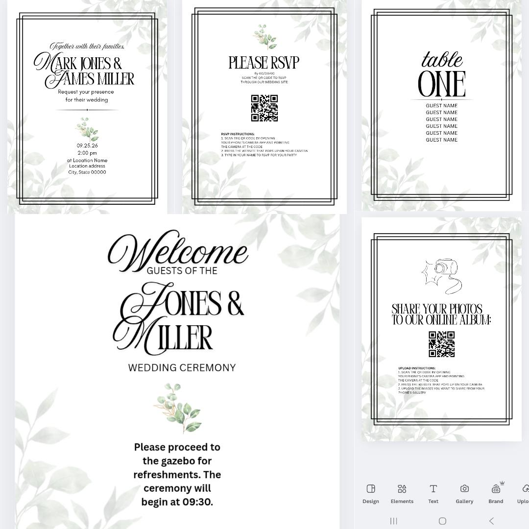 Greenery Canva Template Wedding Bundle including Invitations with a QR code and instructions for RSVPing with a QR code, Table Cards, Signs to direct guests to the ceremony at the venue, and a digital guest book QR code with instructions for use. ALL written and graphic aspects of the template is editable to make it perfect for your wedding!