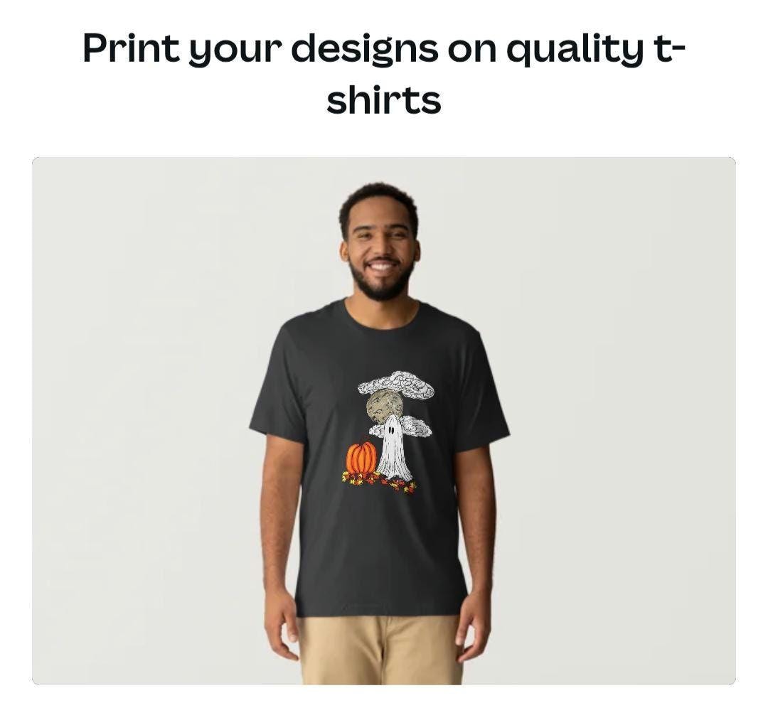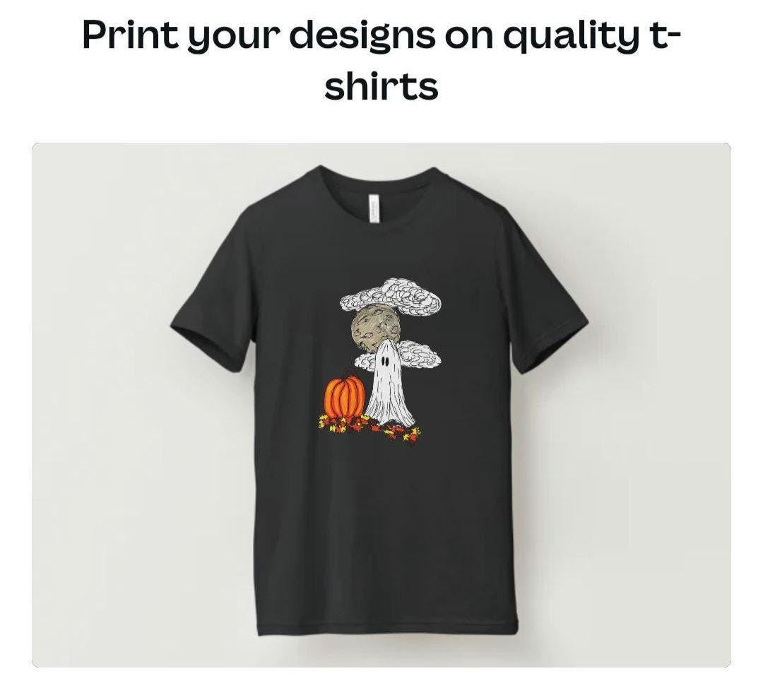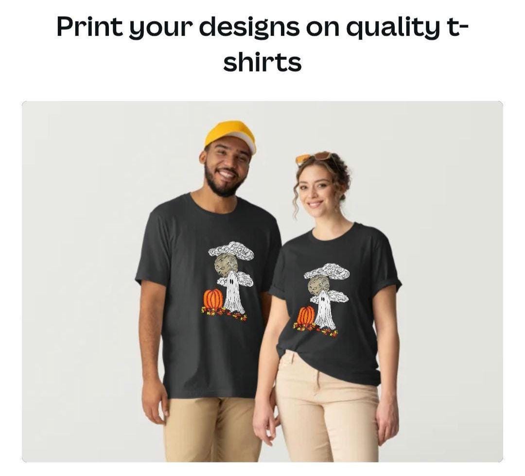 Halloween shirt template in Canva. After purchase, you can order t-shirts through Canva or elsewhere! Purchase includes pdf with template link. Design features ghost, Pumpkin, and Moon.