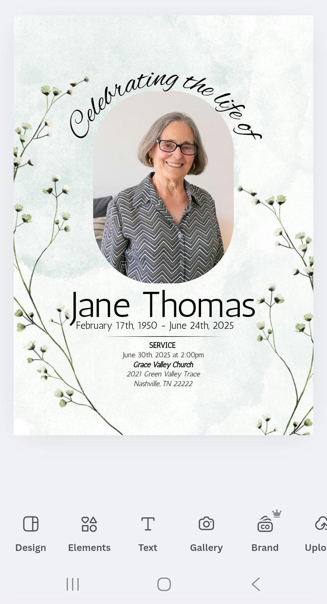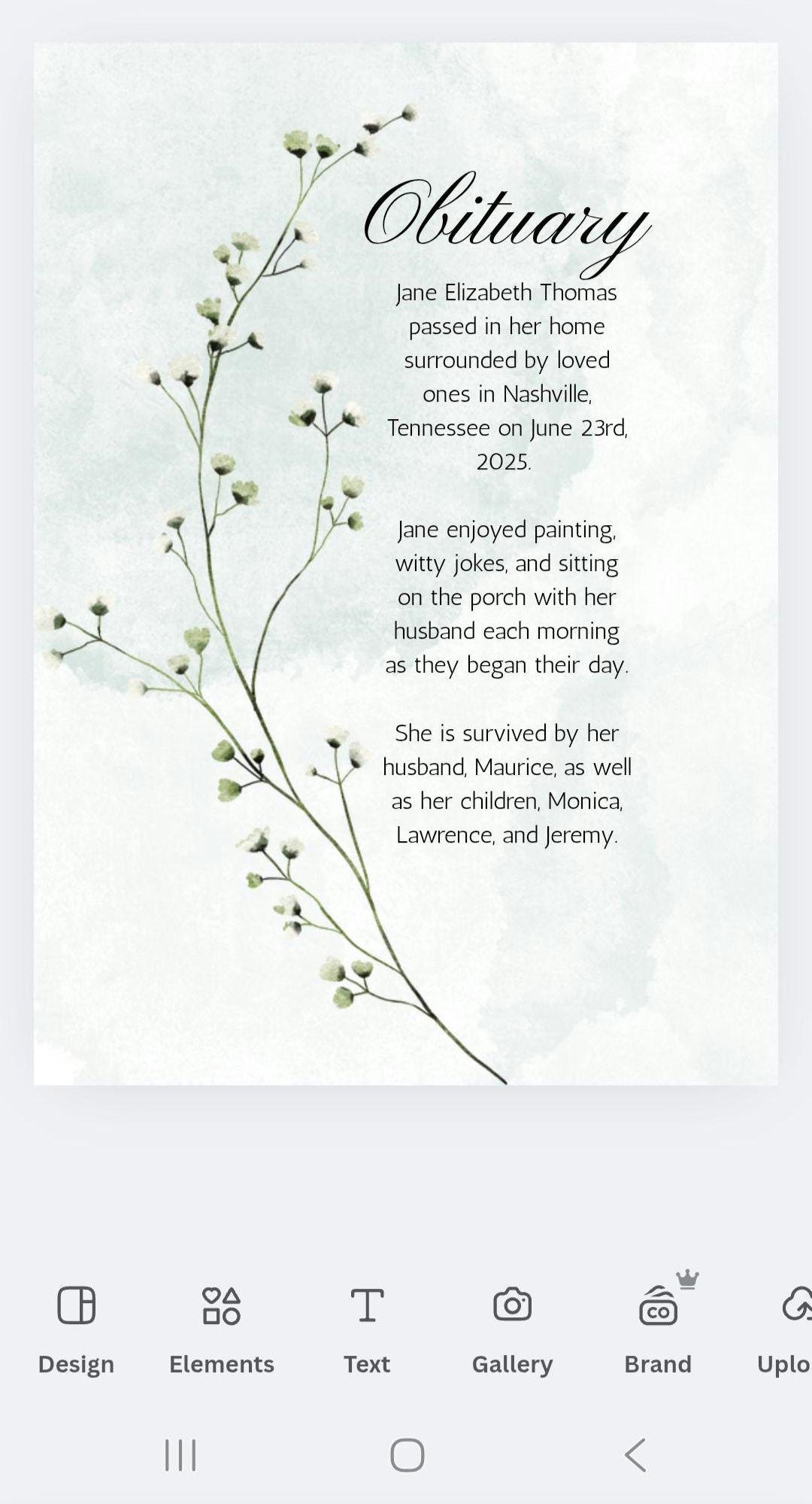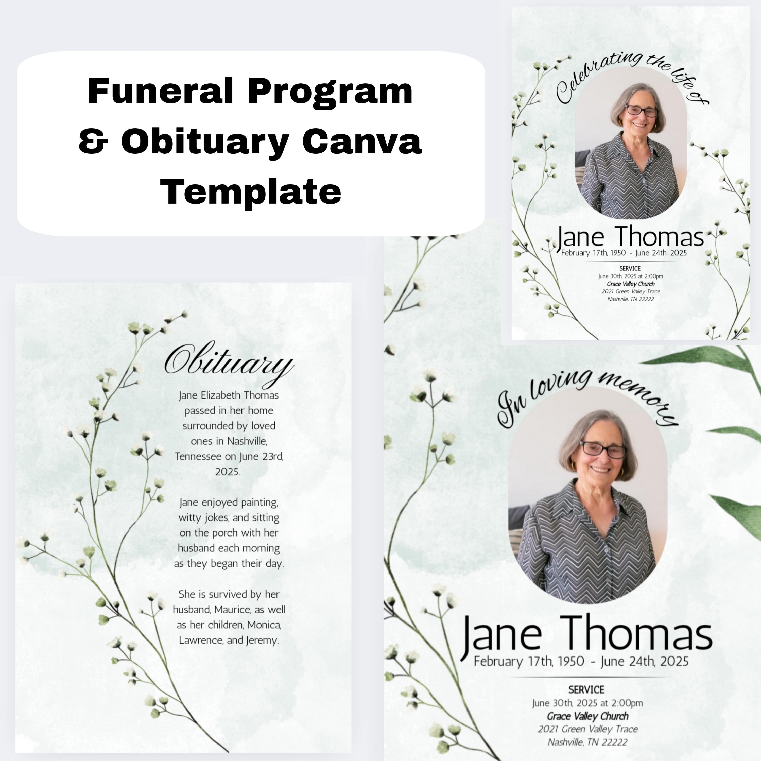 Obituary template in Canva. Editable funeral program or card template with Obituary and cover. Two style options for cover. All completely customizable and editable.