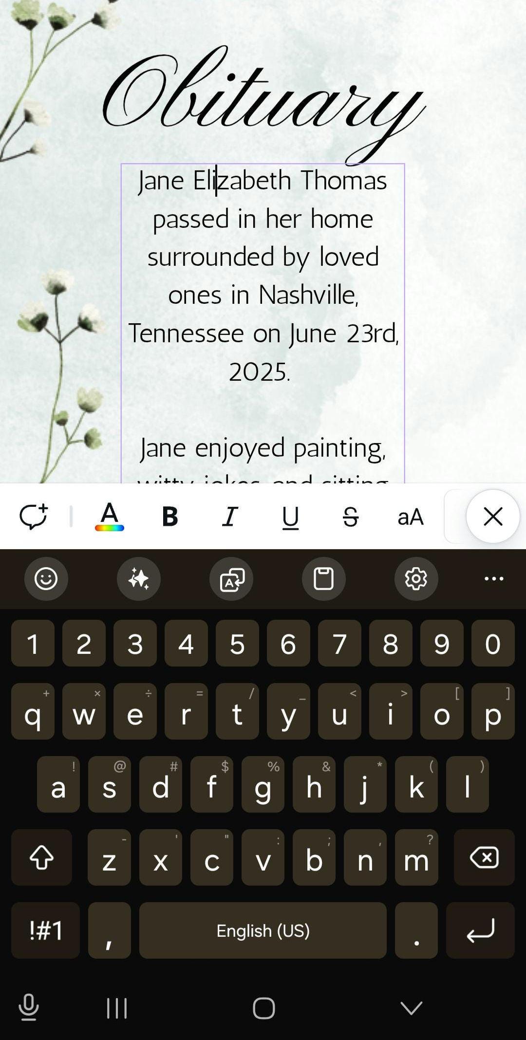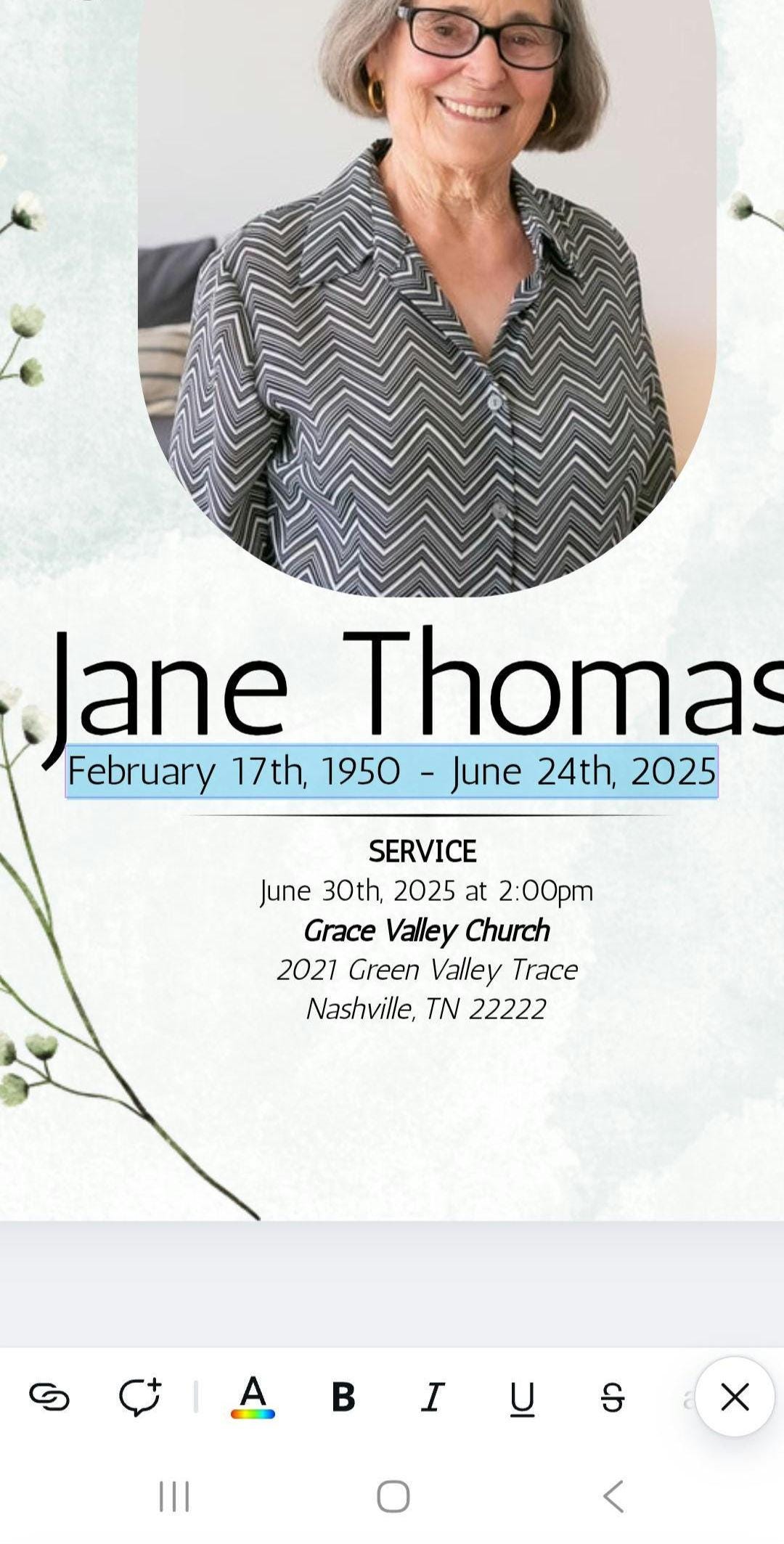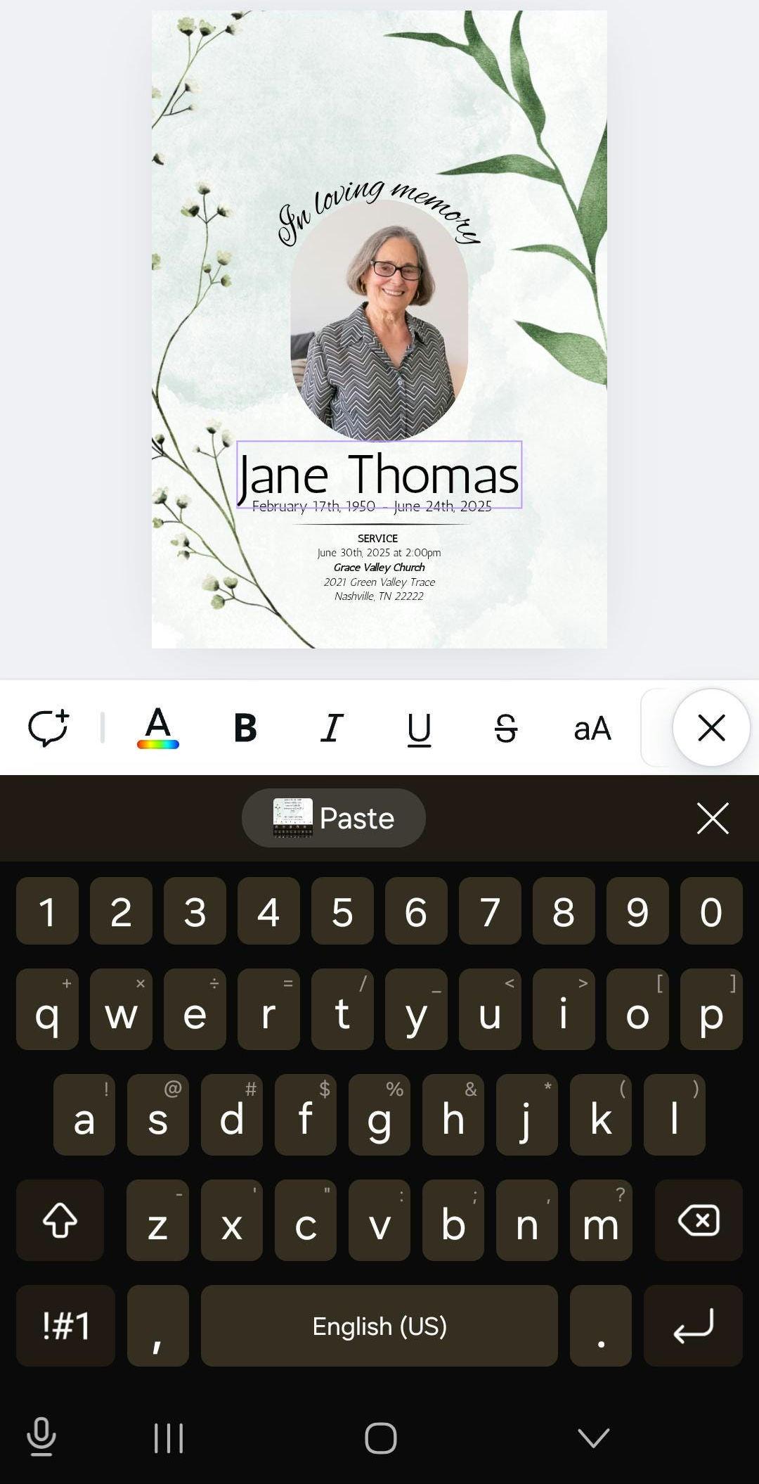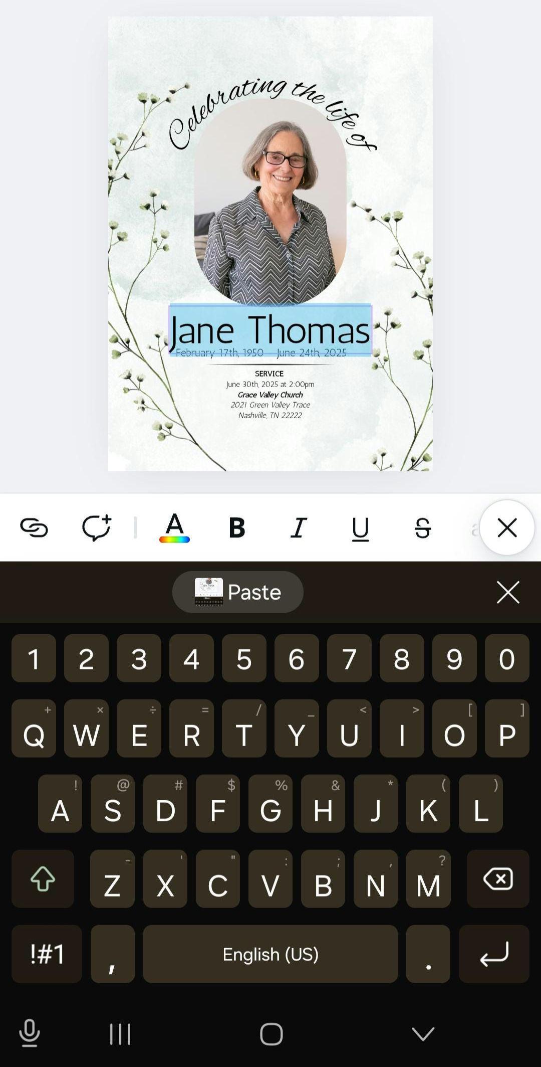 Obituary template in Canva. Editable funeral program or card template with Obituary and cover. Two style options for cover. All completely customizable and editable.