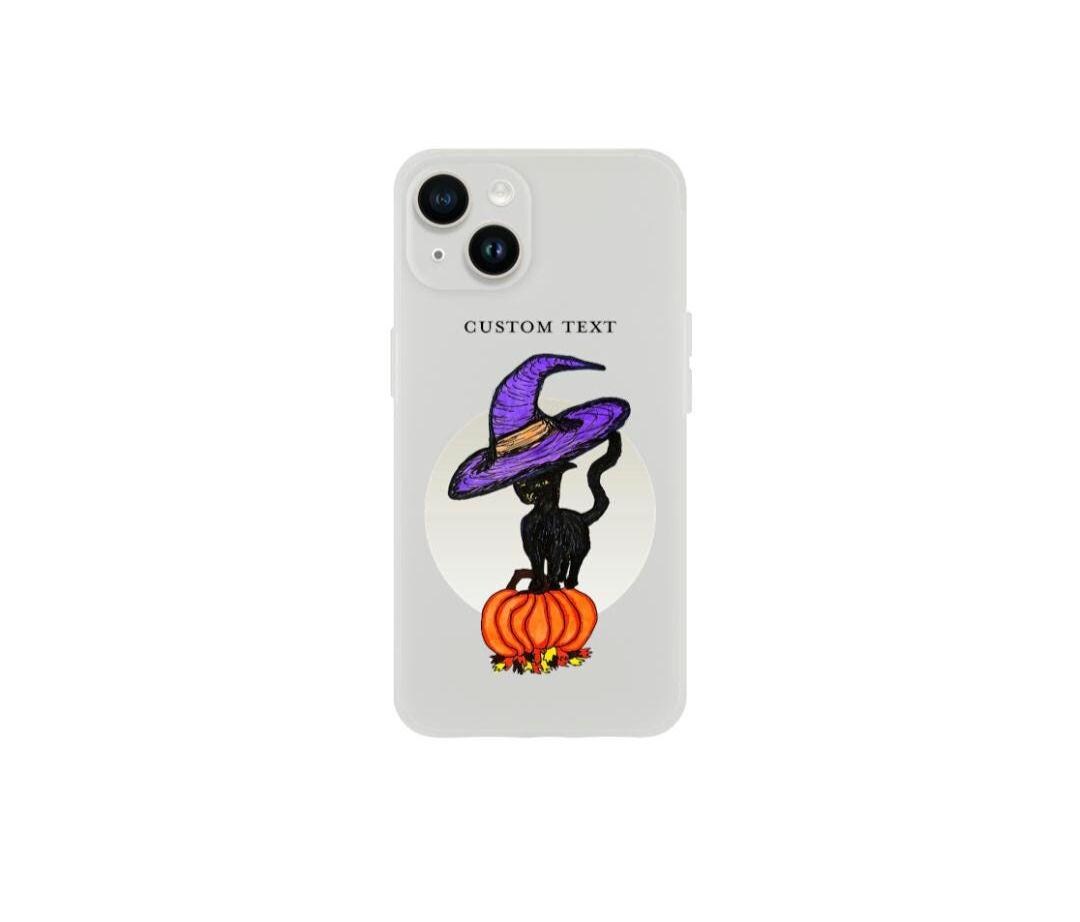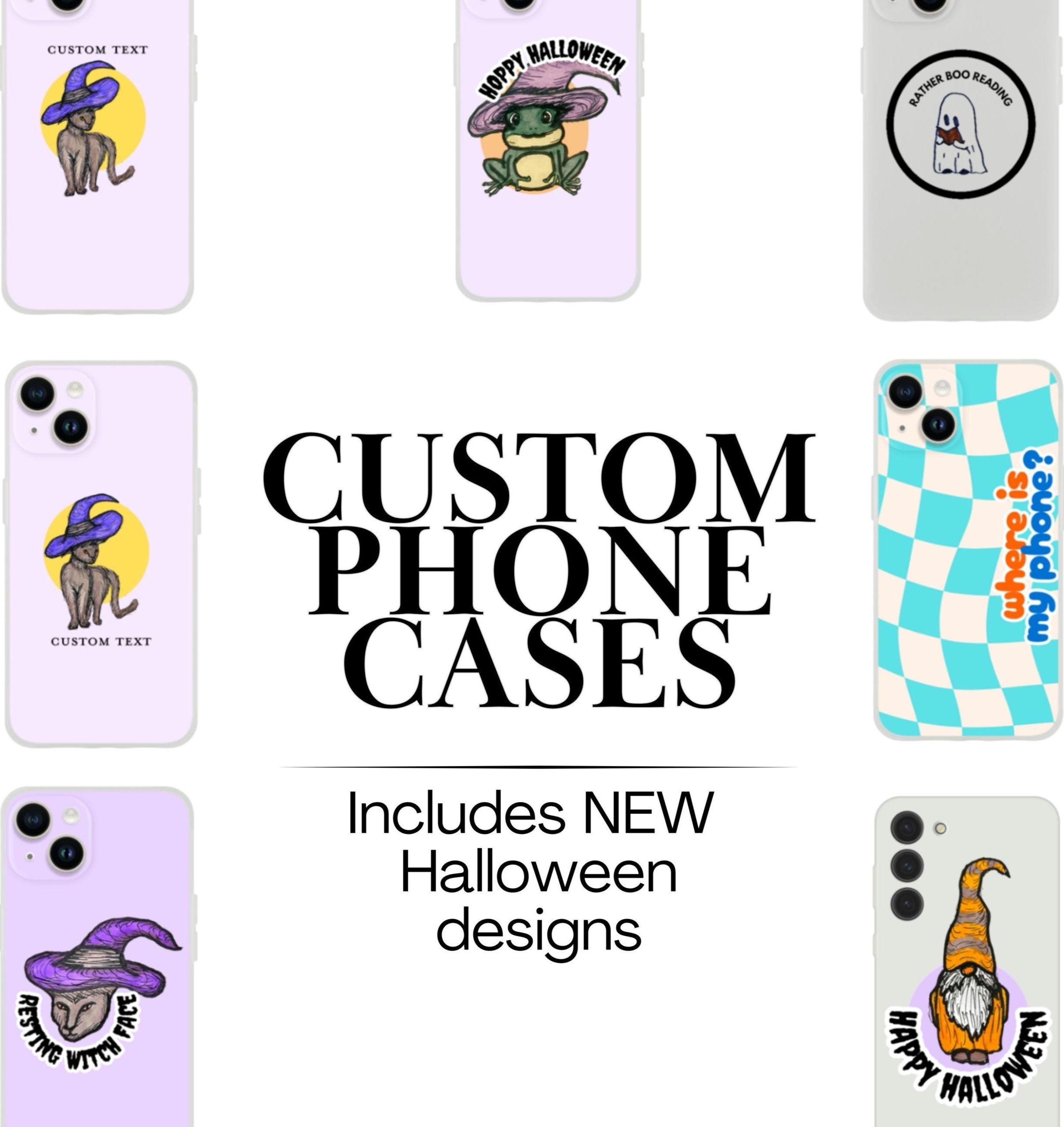 Custom phone cases including halloween designs. Halloween phone case designs include witch cats, witch frogs, ghost reading, and halloween Gnome options.