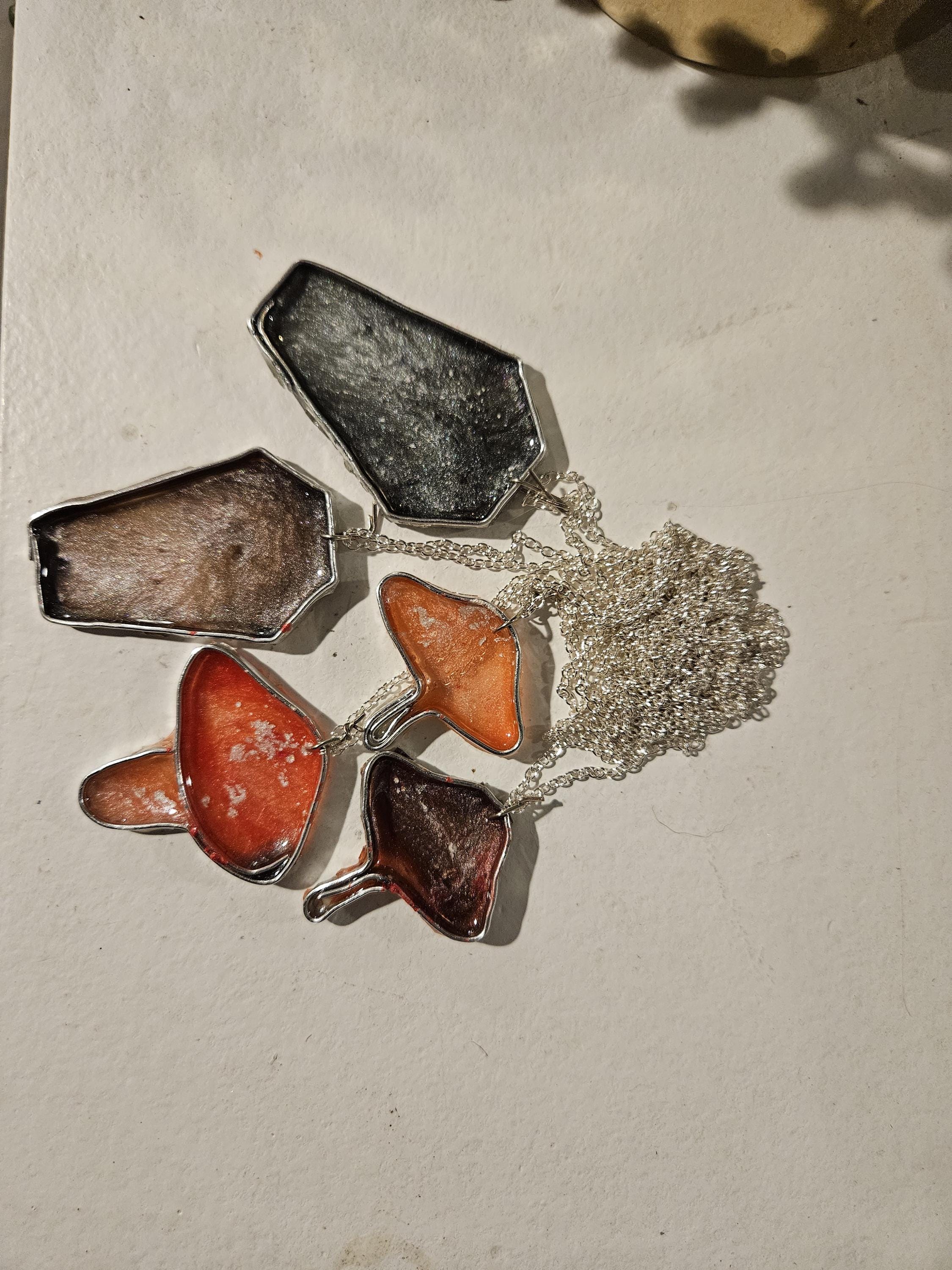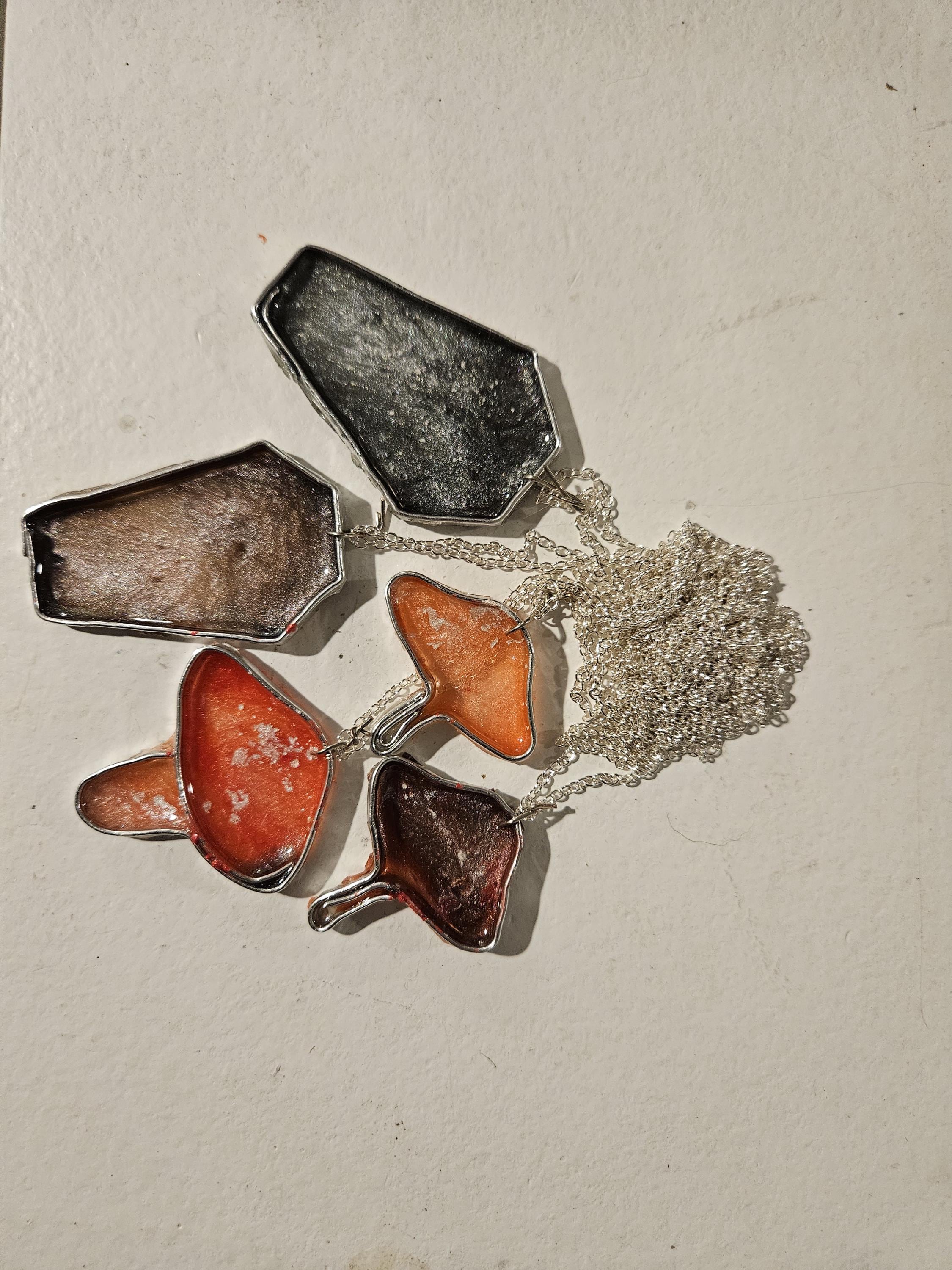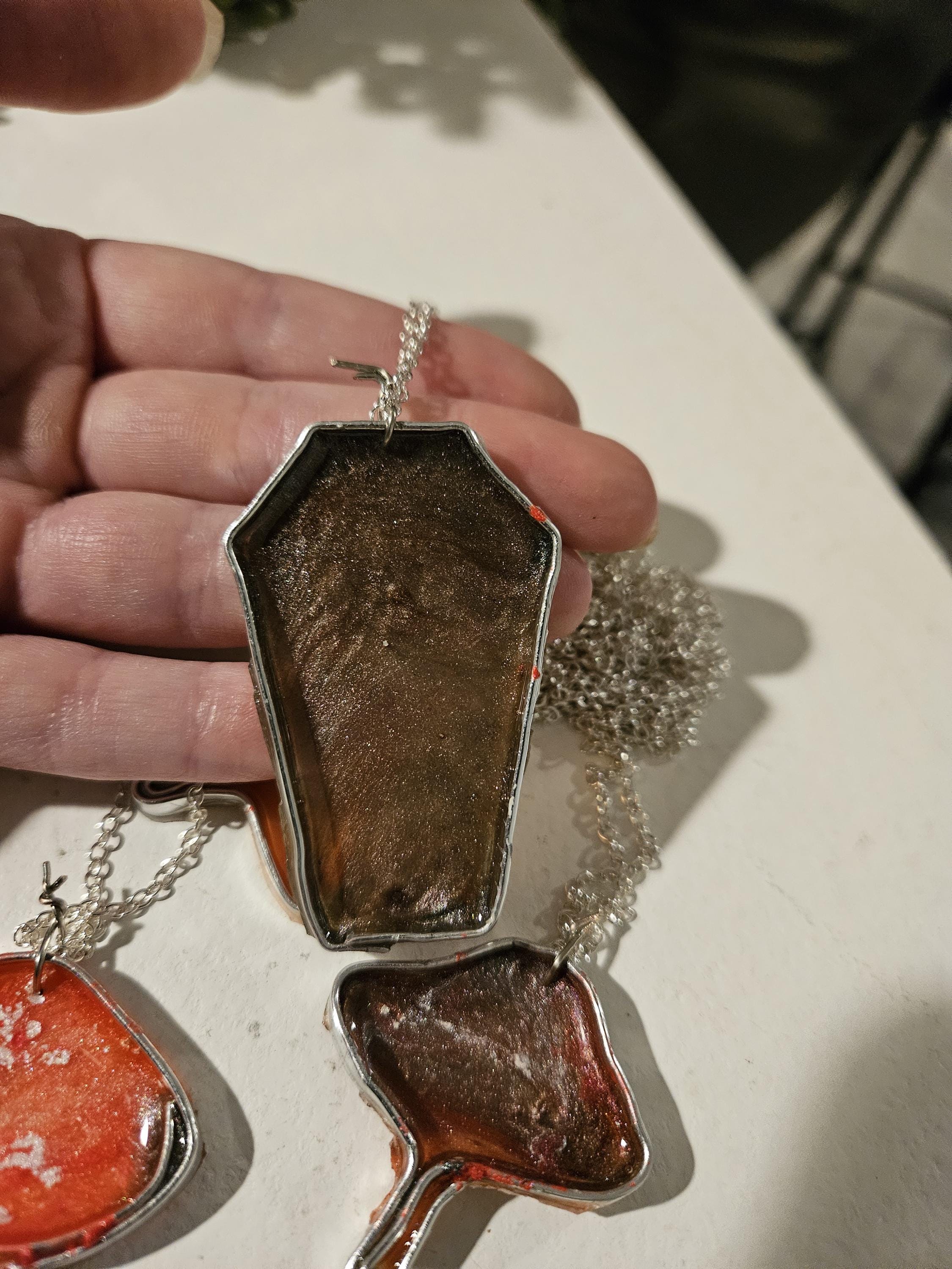 Custom Halloween Necklaces Coffin & Mushroom Charms Handmade Jewelry Comes in custom colors & shapes. Each bezel is handmade and made to Order, so it may vary slightly from those pictured.