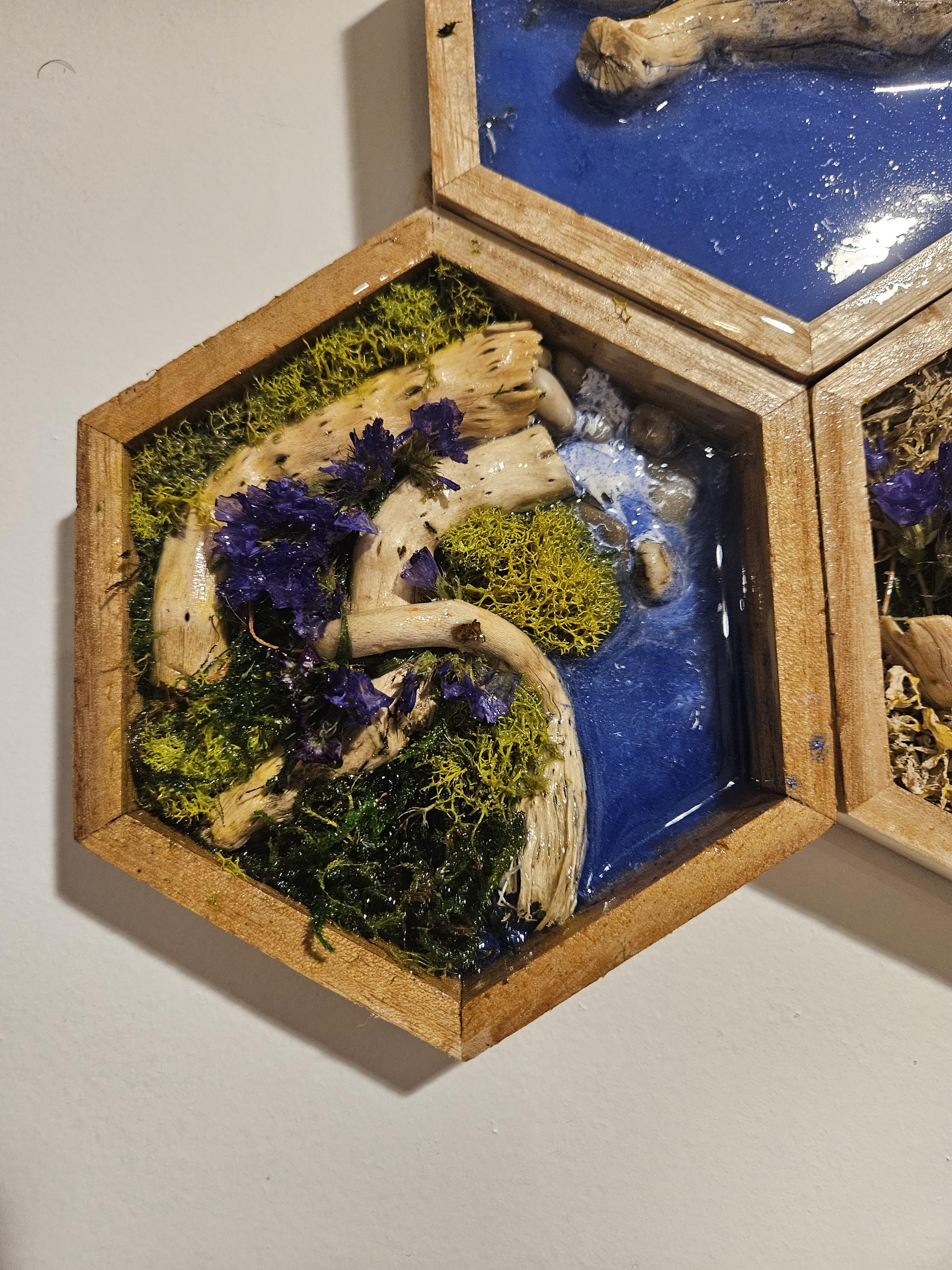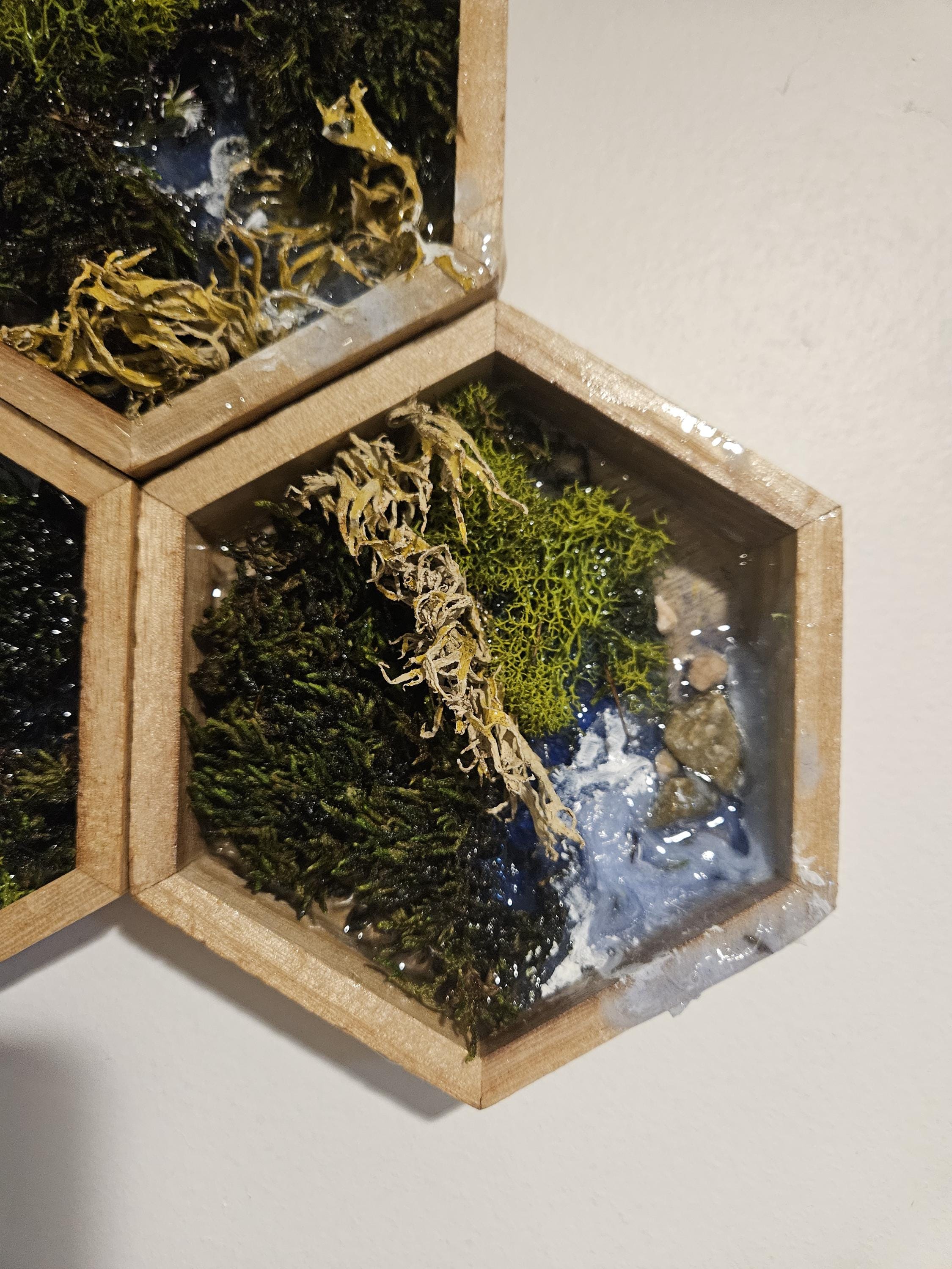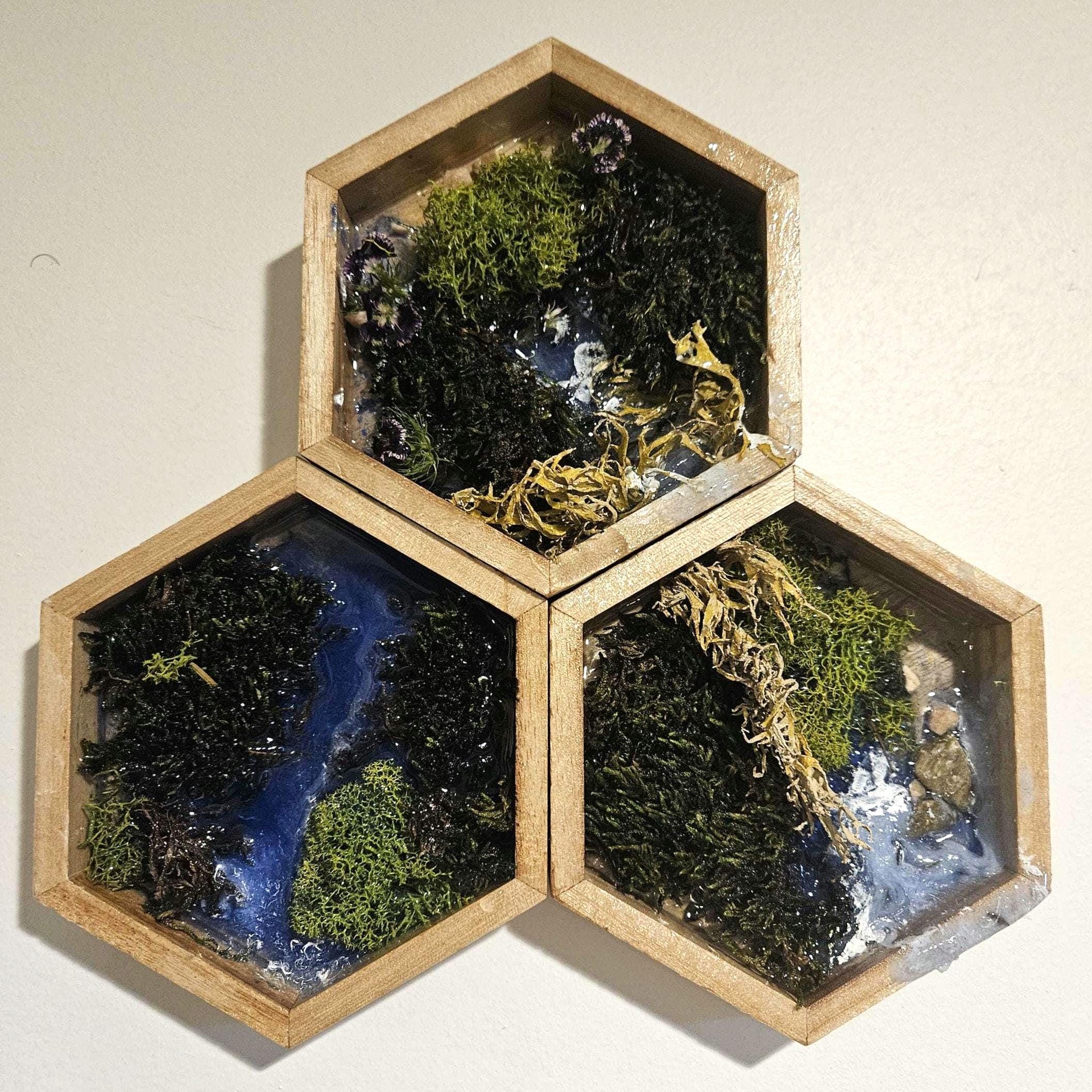 Moss Wall Art With Resin Waterfall & River Scene Real Moss and Flowers Hexagon Shadow Box Frame