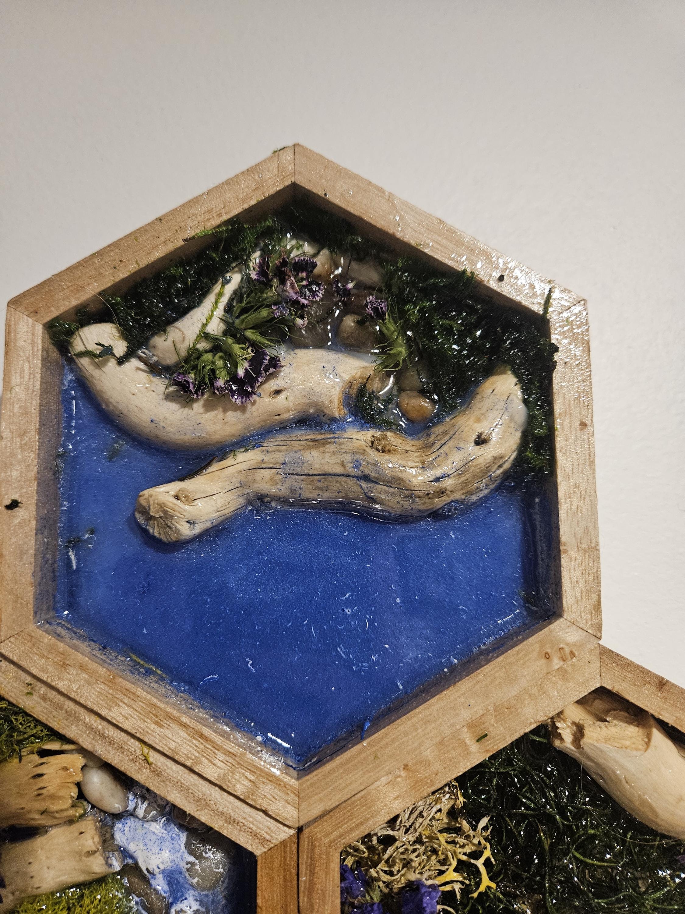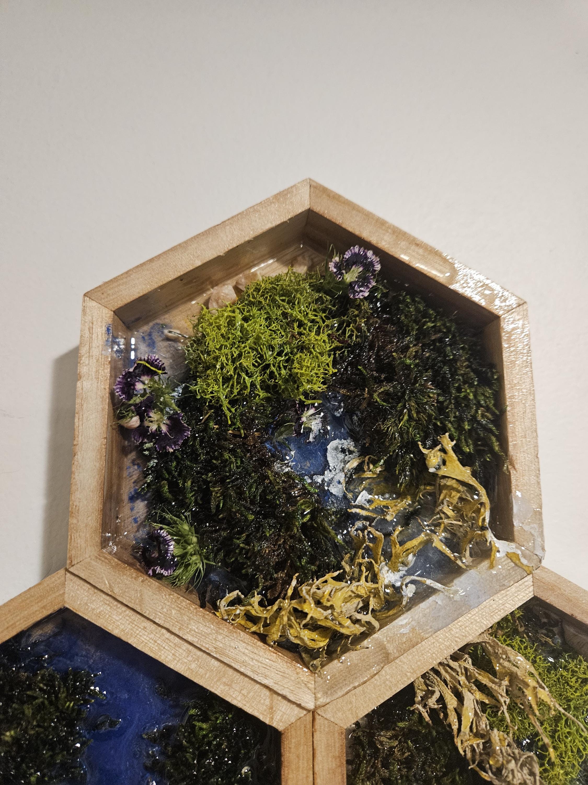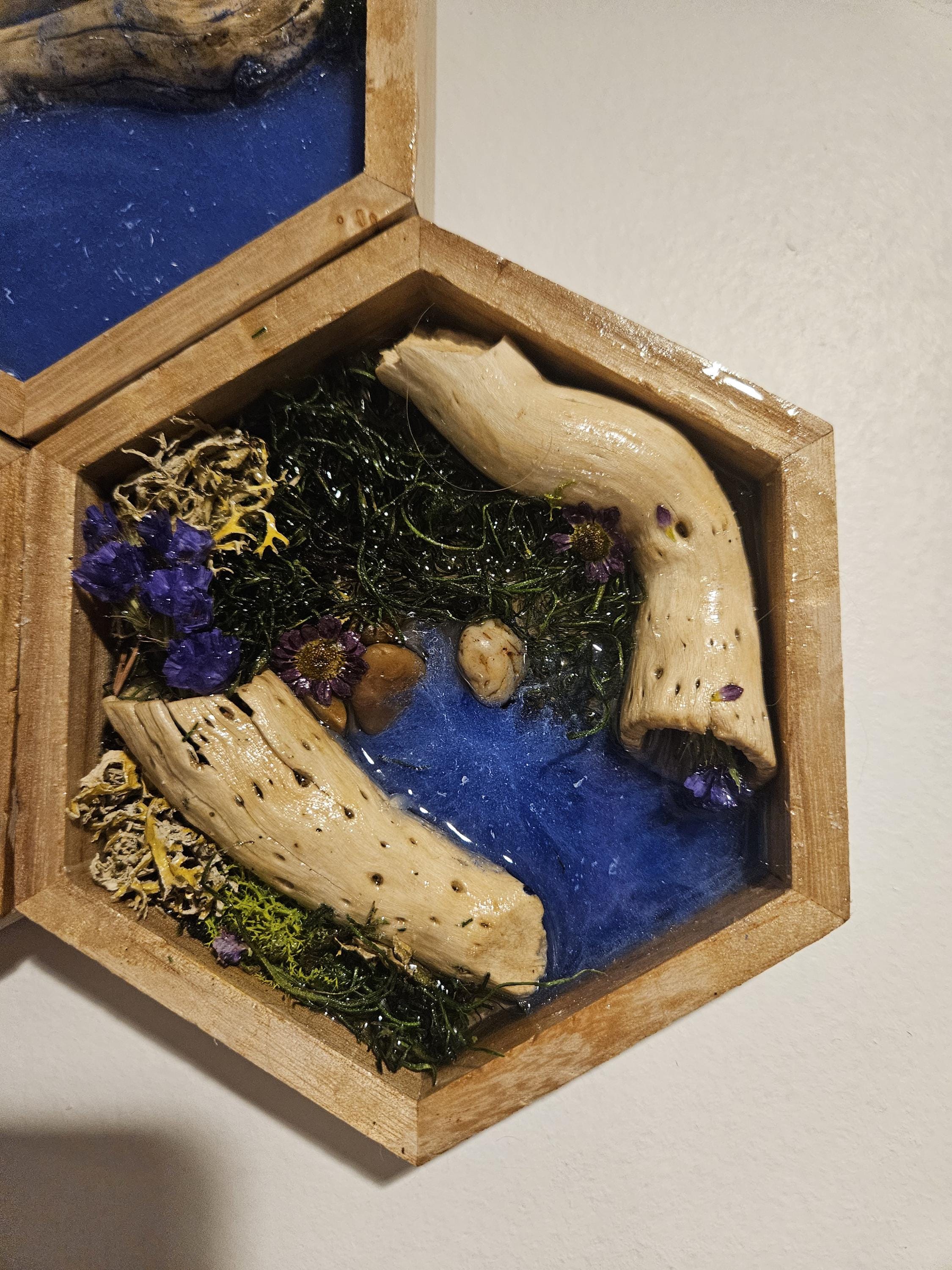 Moss Wall Art With Resin Waterfall & River Scene Real Moss and Flowers Hexagon Shadow Box Frame